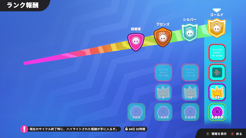 - 下位のランクはポイントが減ることがないため、プレイし続ければゴールドランクまでは必ず上がれます。