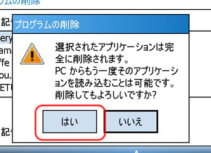 プログラムの削除の確認ダイアログが表示されますので、はいを選択することによってアプリケーションを削除することができます。(プラグインをインストールしている場合は同じようにプラグインもアンインストールしてください。プラグインは先にアンインストールしても後にアンインストールしてもかまいません。)