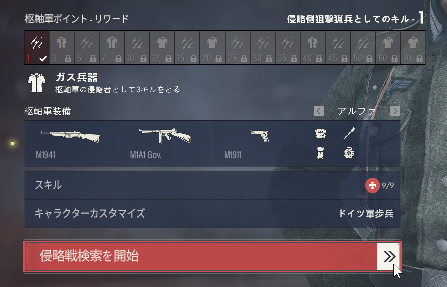 Dans la version inverse de la précédente « bataille de sniper », vous envahirez l’adversaire depuis ici. Tous les PNJ qui étaient à l’origine ennemis sont considérés comme des compagnons, ce qui leur donne un avantage numérique écrasant, mais en retour, leur équipement est médiocre. Donc, à moins d’être pris en embuscade, il vaut mieux se battre avec des PNJ. Selon le joueur adverse, les PNJ peuvent éliminer l’adversaire par eux-mêmes. Cependant, cette médaille oblige le joueur à vaincre lui-même l’adversaire, donc il n’y a aucun intérêt à ce qu’un PNJ le batte. En gros, les joueurs subissant une « invasion de l’Axe » sont souvent forts et peuvent voir des PNJ anéantis, donc faites attention. Si l’adversaire est en mouvement (l’alarme retentit ou se bat), affrontez le PNJ dès que possible. Si votre adversaire est du type embuscade, vous ne pourrez pas utiliser de PNJ, donc soyez prudent à les chercher et à vous battre. Il n’y a presque aucun facteur négatif même si vous perdez, alors essayez encore et encore.