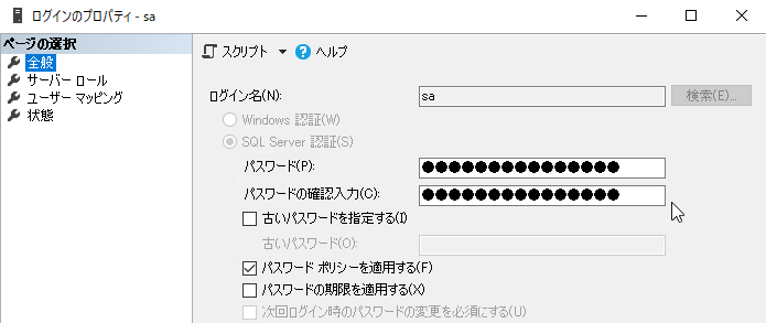 SQL Server Management Studio を開き、「オブジェクト エクスプローラー」から「サーバー」「セキュリティ」「ログイン」を展開し、「sa」を右クリックして「プロパティ」を選択します。