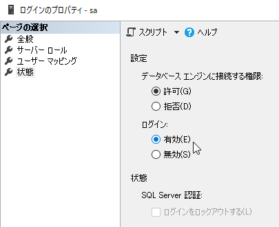 sa アカウントでリモート接続したい場合は設定してください。sa は権限が最上位であるため、不要であれば無効にしておくのがよいでしょう。ちなみに SQL Server インストール時に SQL Server 認証を有効にしている場合はすでに sa アカウントのリモート接続は有効になっています。