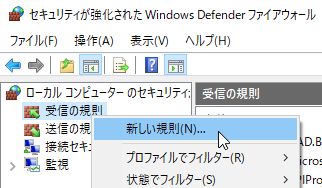 「セキュリティが強化された Windows Defender ファイアウォール」を開き、左のツリーから「受信の規則」を右クリックして「新しい規則」を選択します。