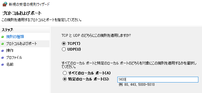 SQL Server のインスタンス名を指定していない場合は「特定のローカル ポート」に「1433」を入力します。