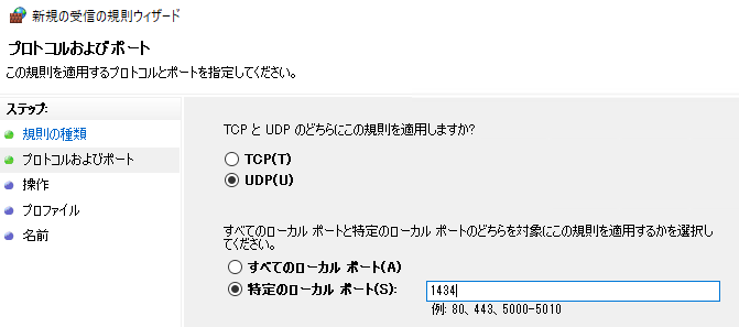 「UDP」を選択し、「特定のローカル ポート」に「1434」を入力します。