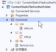 静的ファイル (.js や .css, .png など) は既定では wwwroot フォルダの下に置くことが決まっています。 これにより Web サイト利用者は HTML と一緒に .js ファイルや .css ファイルを直接参照することができ画面に反映させることができます。