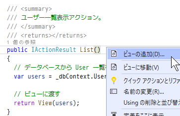 以下のコードはユーザーの一覧表示と新規登録を処理するコードです。 いずれも ASP.NET Core, Entity Framework Core 各々のコードになりますので細かい説明は省きます。 また、ユーザーの要求が終わるとコンテキストは自動的に破棄されます。