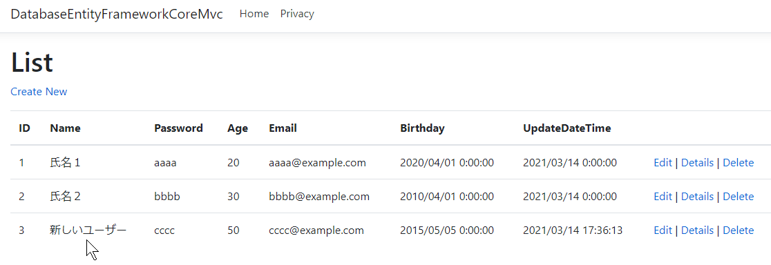 編集や削除処理は作成していませんので、一覧の右にある「Edit | Details | Delete」をクリックしてもエラーになります。 Create と同じ手法で作成できますので試してみてください。一応サンプルコードには上記3つの処理も追加しています。