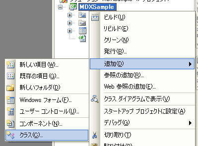 まずクラスをひとつ作成しましょう。基本的にサンプルはこのクラスにコードを書くようにします。プロジェクトを右クリックし、クラスを追加します。
