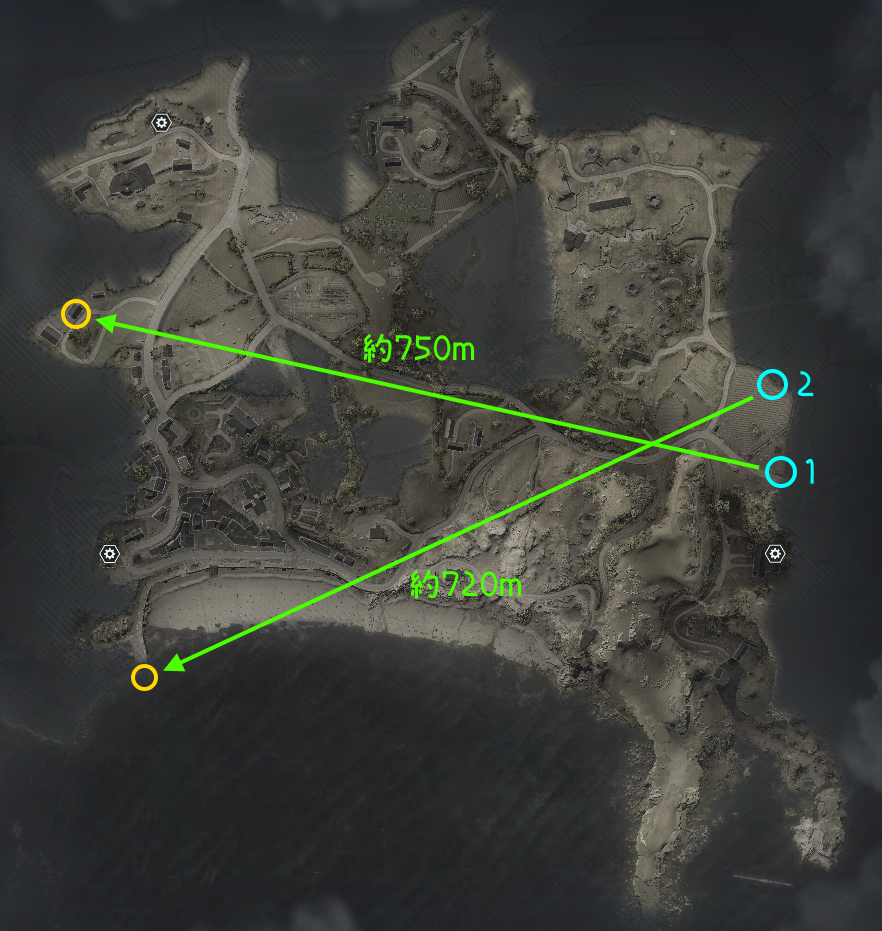 おそらくこのパターンが最も主流であり、必要な 725m に対して 750m 以上でヒットします。 上の図でいうと1番の箇所になります。 ただ距離もほかのミッションに比べて相当あり視認性もむちゃくちゃ悪いので場合によっては何十回とやり直すことになるので覚悟はしておいてください。