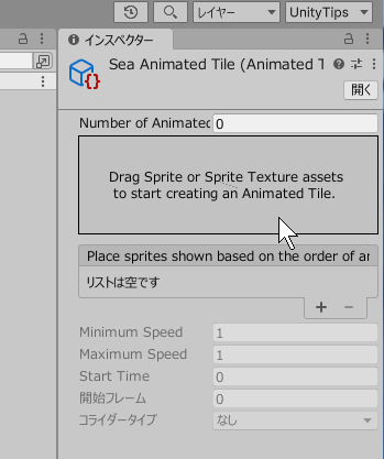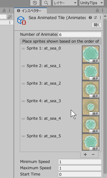 Animated Tile を選択してインスペクターの下の方を見るといくつか設定項目を確認することができます。