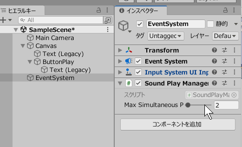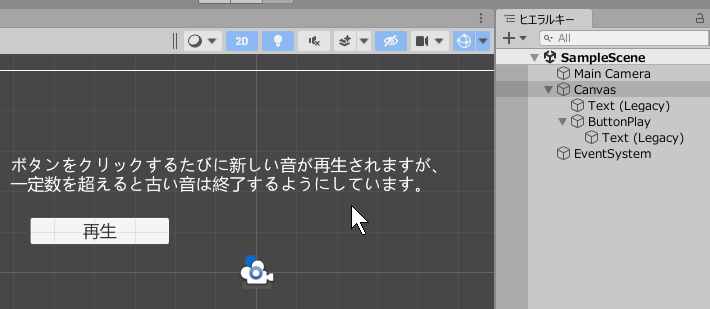 完成したらゲームを実行します。 初期値では同時再生数上限を2に設定しているので、2つ音が鳴っている最中にもう一度ボタンをクリックすると一番最初の音が消えることを確認してみてください。