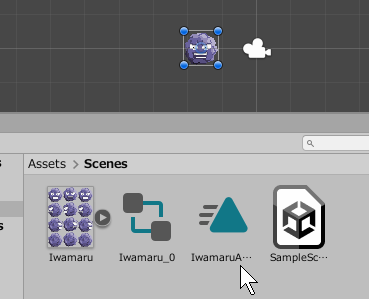 ヒエラルキーから「Iwamaru_0」を選択し、アニメーションを「IwamaruDown」に変更します。