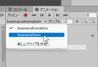 すでに自動で生成されたアニメーションがありますがいらないので後で削除します。 今回名前を付けた「IwamaruAnimation」というドロップダウンがあるのでクリックし「新しいクリップを作成」を選択します。