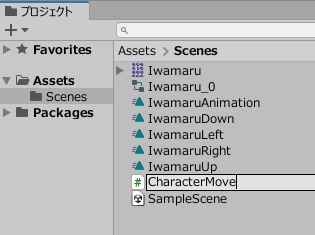 移動はキーボードのキーを押して動かすのでスクリプトを作成して制御します。 今回スクリプトはキャラクターにアタッチするので「CharacterMove」としておきます。