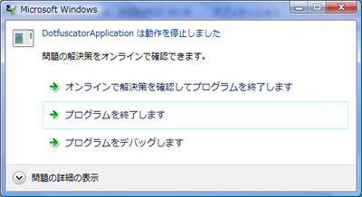 難読化した exe はそのまま実行して使うことができます。しかし、右図のように不明なエラーで起動できない場合もあります。