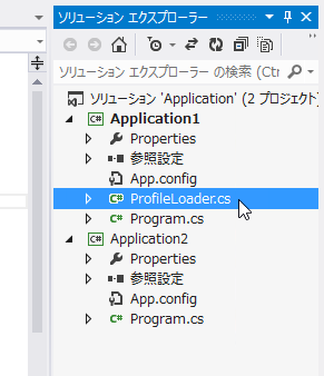 ここでは Application1 と Application2 というプロジェクトを作成しており、ソースファイルの実体は Application1 が持ち、Application2 はそのソースファイルを参照するという形にしています。下の図では「ProfileLoader.cs」ファイルを Application1 に持っているのでこれを Application2 のプロジェクトが参照するようにします。