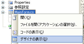 まず、コントロールは基本的にフォームに配置することになるので、ソリューションエクスプローラーから MainForm.cs を右クリックして「デザイナの表示」をクリックしてください。(MainForm.cs をダブルクリックしても開けます)