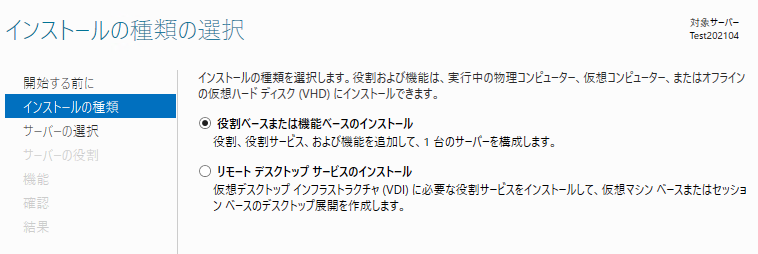 「役割ベースまたは機能ベースのインストール」にチェックが入っていることを確認します。