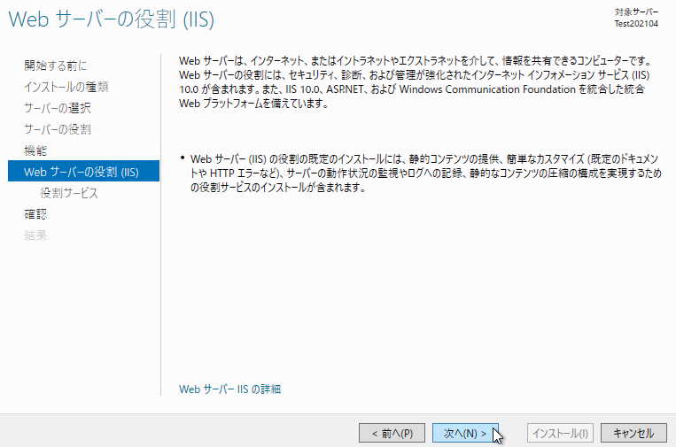 「役割サービスの選択」では使用する Web アプリケーションの機能によっては必要なチェックを追加しますが、後でも追加可能なので現時点で分からなければそのまま「次へ」を選択しても問題ありません。