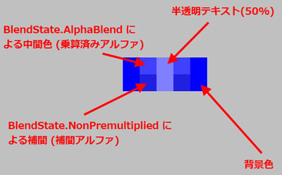 背景色が (r:0, g:0, b:255) であるため、BlendState.AlphaBlend による補間の場合 (r:64, g:64, b:255) となり、背景色の色素を損なわずに文字の透明色を綺麗に表現できています。しかし BlendState.NonPremultiplied による補間の場合は (r:32, g:32, b:224) となっており、青成分が背景色よりも暗くなっているため、文字の淵が黒ずんだように表示されてしまうのです (もちろん